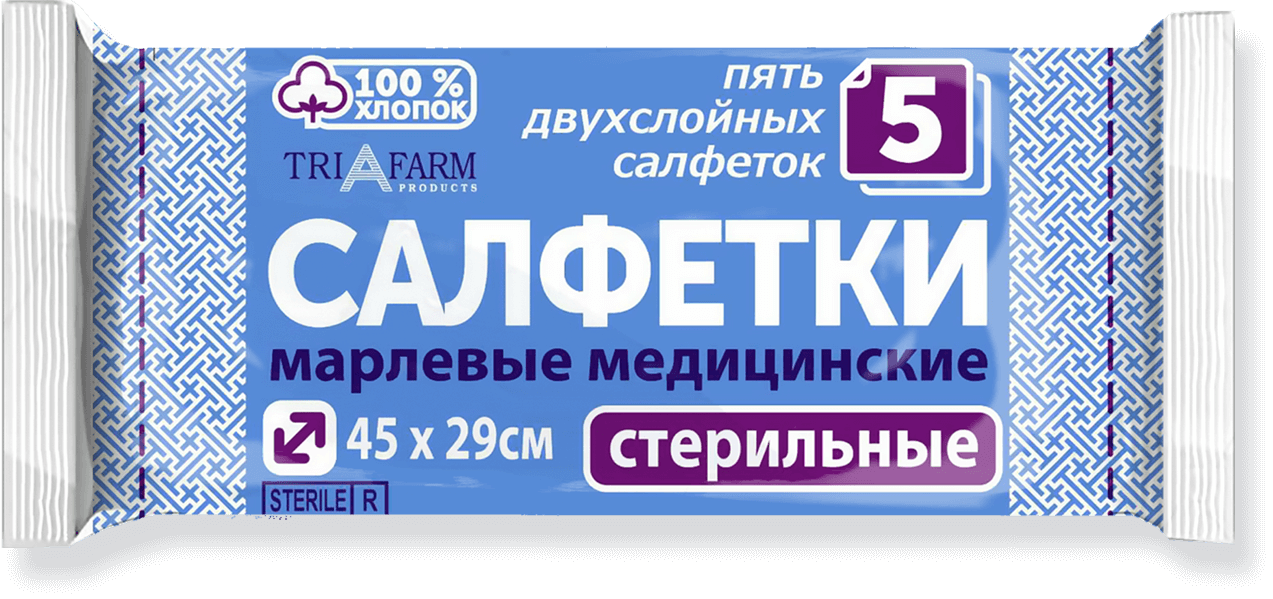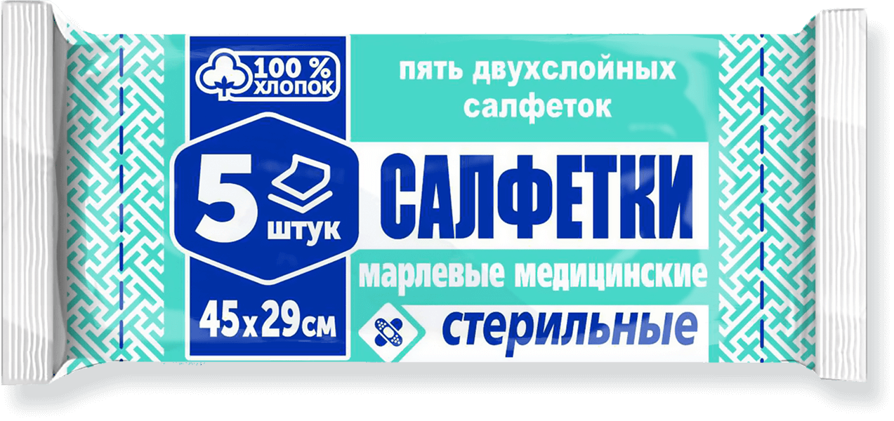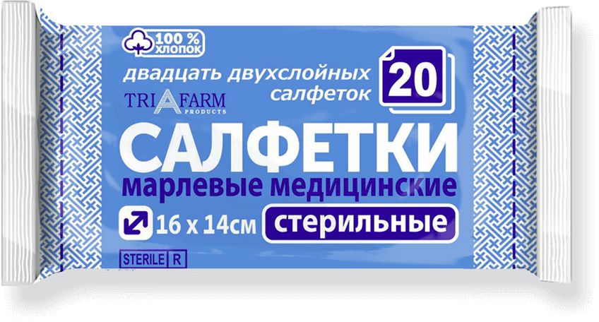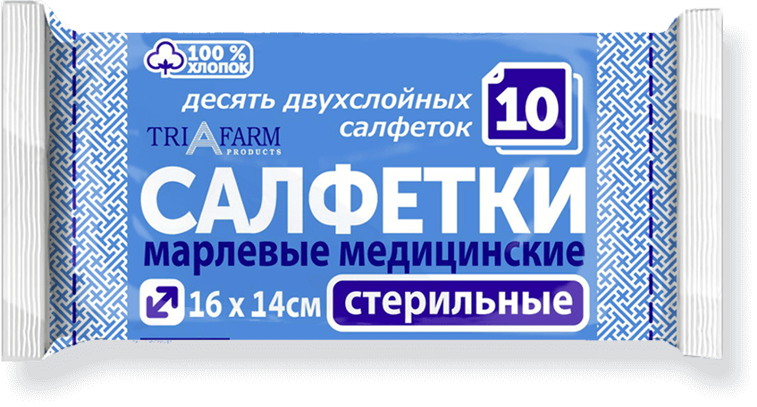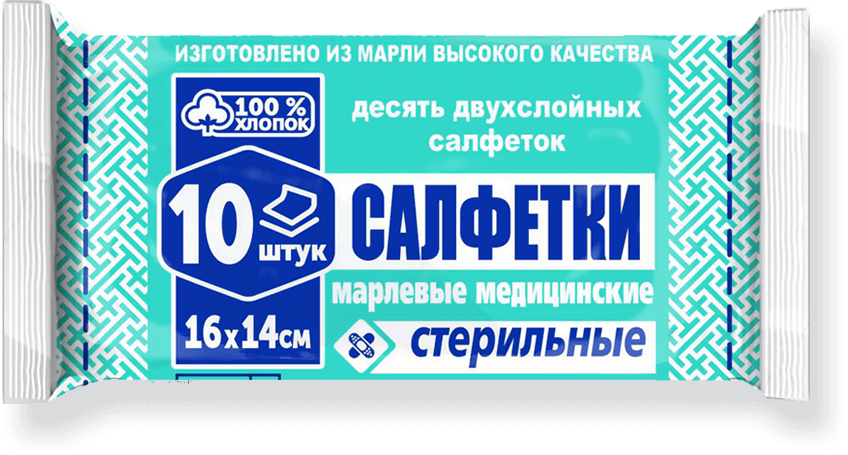 Салфетки марлевые медицинские стерильные предназначены для использования в качестве готовых операционно-перевязочных средств. Салфетки изготовлены из медицинской отбеленной хлопчатобумажной марли, без швов. Салфетки изготовлены по ТУ — благодаря чему есть возможность изготавливать продукцию разной плотности. ТУ 9393-003-97833304-2011